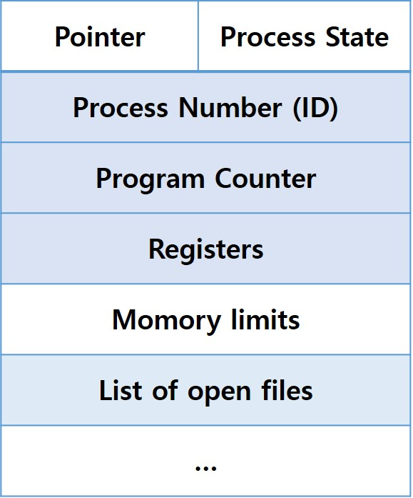 - 각각의 프로세스는 자신의 정보 묶음인 PCB를 가지고 있다. PCB에는 프로세스 상태와 PID, 프로그램 카운터, 메모리 한계, 레지스터 정보 등이 담겨있다.